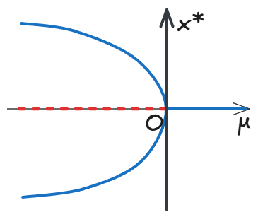 系统以 μ = 0 为界分为两个相。原点在 μ < 0 时是不稳定驻点,μ > 0 时是稳定驻点。